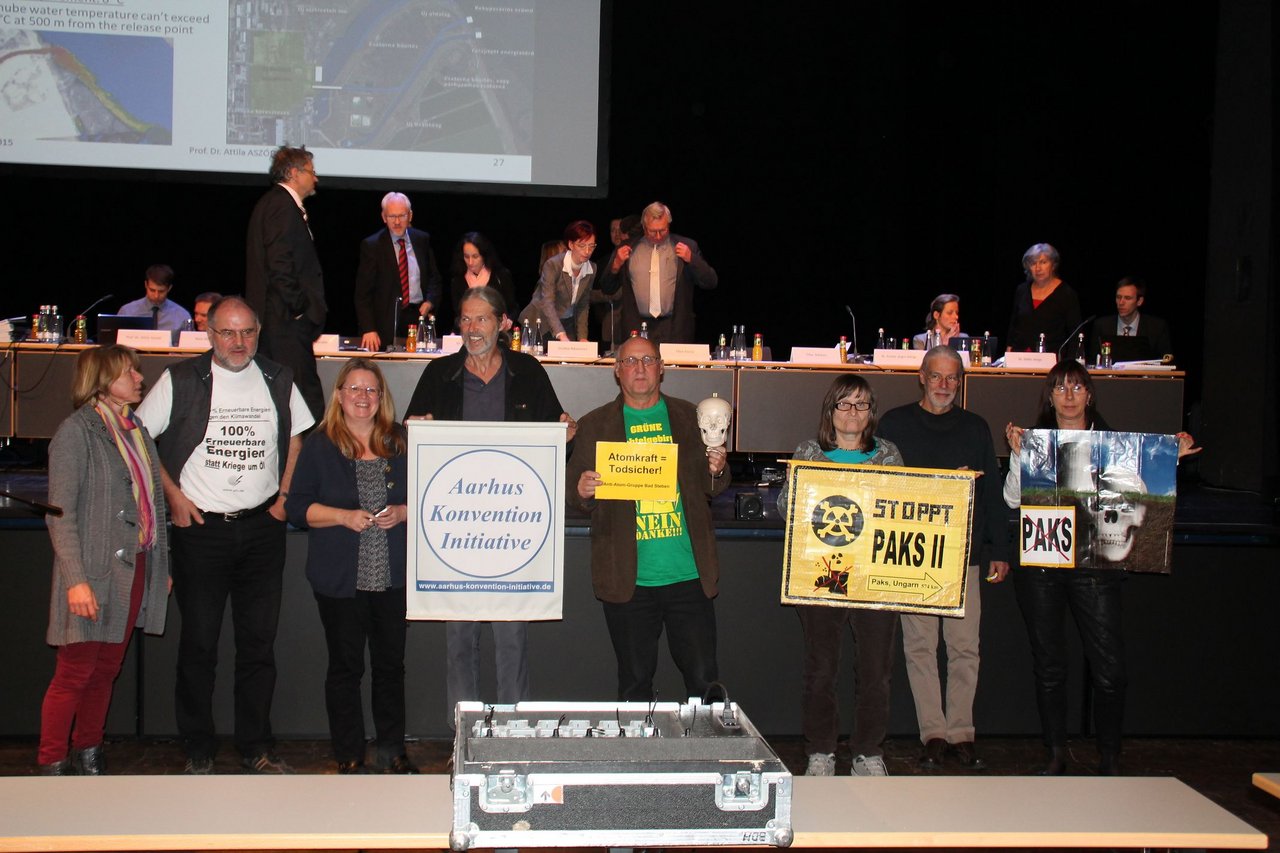 In Ungarn wurde nur ein ganz kleiner Teil der Öffentlichkeit im Umkreis von 500 Metern um das AKW beteiligt und nur die wichtigsten NGOs wurden zugelassen[1]. Bei der Anhörung in Paks in Ungarn gab es tätliche Übergriffe auf deren Kleinbus und verbale Attacken gegen deren Vertreter. Auch der ungarische Europa-Abgeordnete Benedek Jávor, Mitglied der Grünen Europafraktion, war aus der öffentlichen Beteiligung wie alle anderen Ungarn außerhalb des 500 Meter Radius ausgeschlossen. Er hatte im Europaparlament geleakte Dokumente von der ungarischen Regierung vorgelegt, die das ganze Umweltverträglichkeitsverfahren in Zweifel ziehen[2]. Auf die Frage Oda Becker`s an die ungarische Delegation, wie Jávor`s Stellungnahme in die Umweltverträglichkeitsprüfung einbezogen worden sei, sagte der ungarische Verhandlungsführer Attila Aszódi nein, davon sei nichts bekannt. Das Publikum stellte fest, man werde die Stellungnahme des ungarischen Europaabgeordneten über Deutschland einbringen, da die Frage relevant für das Umweltverträglichkeitsverfahren sei und so nicht beantwortet wurde.
