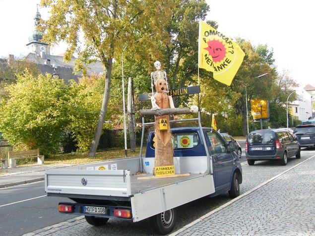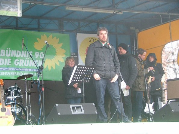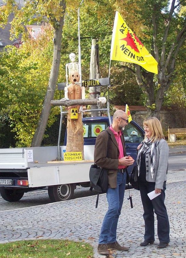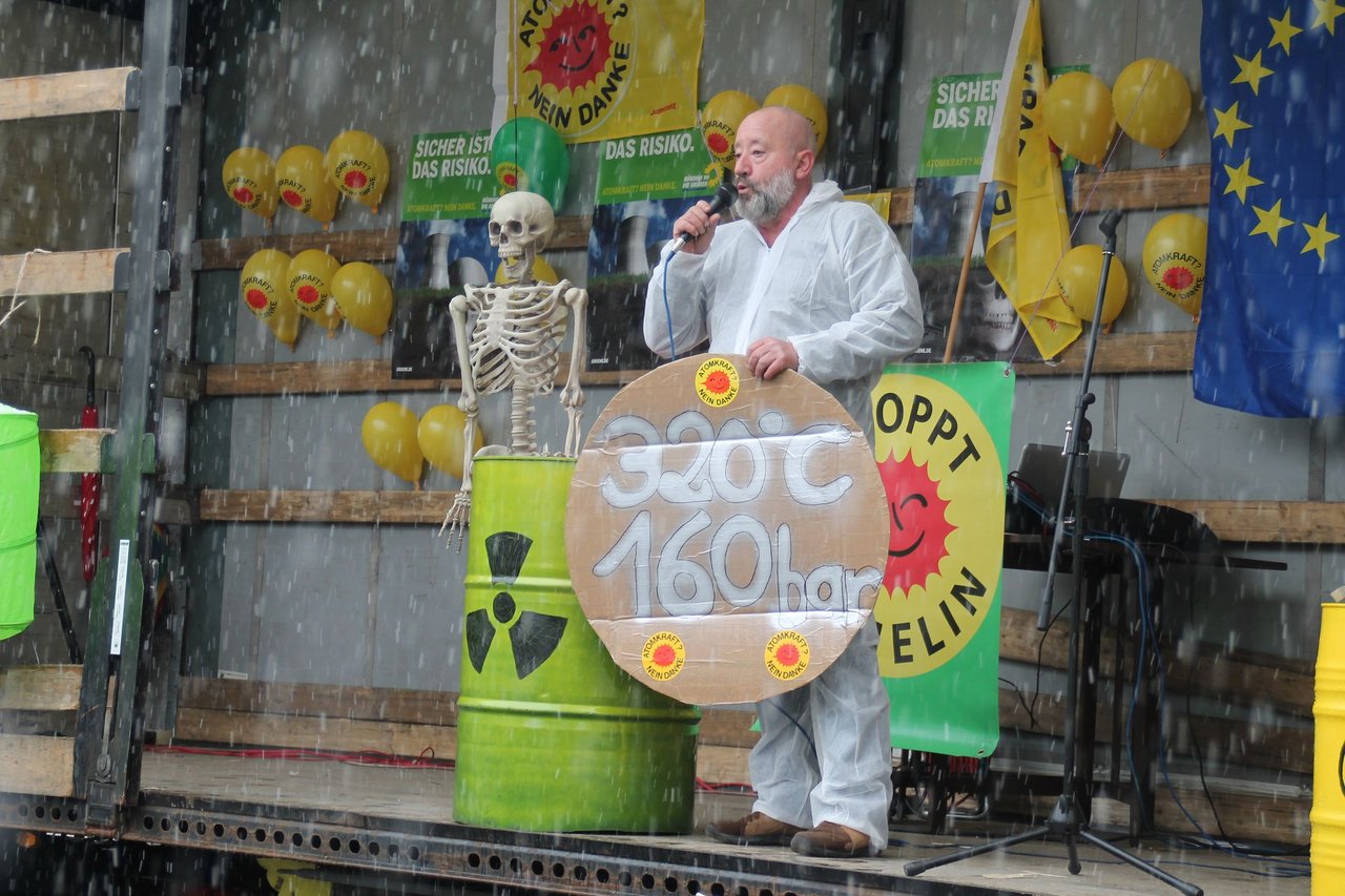 Stefan Schneider, der zusammen mit seiner Frau Beate und einigen getreuen Helfern die Demo alljährlich organisiert, erklärte auf eindrückliche Weise, „worüber man reden würde“. Er hatte ein Modell eines 80 cm dicken Kühlwasserrohres von Temelin 1 gebastelt, auf dem 320 Grad und 160 bar standen. Unter diesem Druck stehen diese mit radioaktiver Flüssigkeit gefüllten Leitungen um deren Schweißnähte der Kampf tobt.