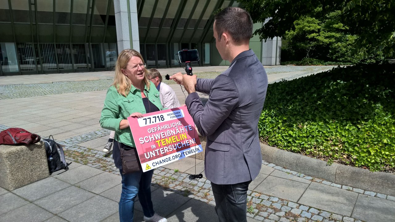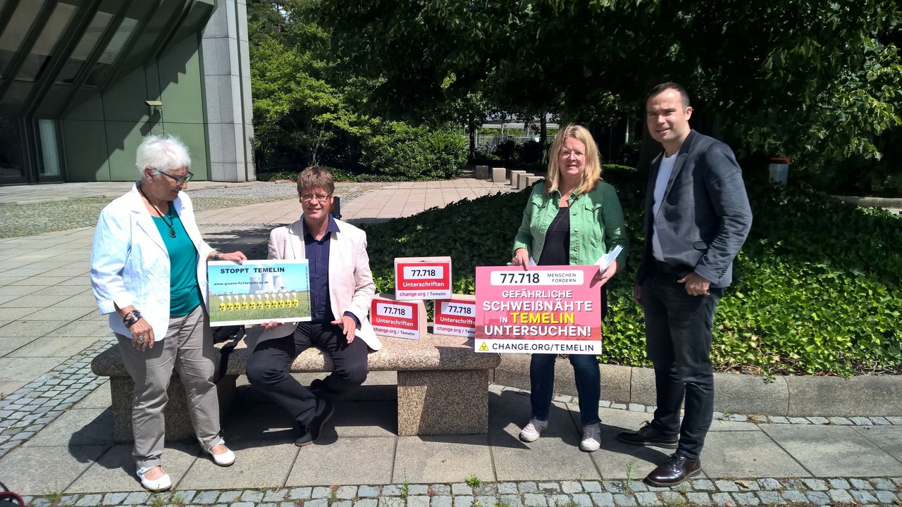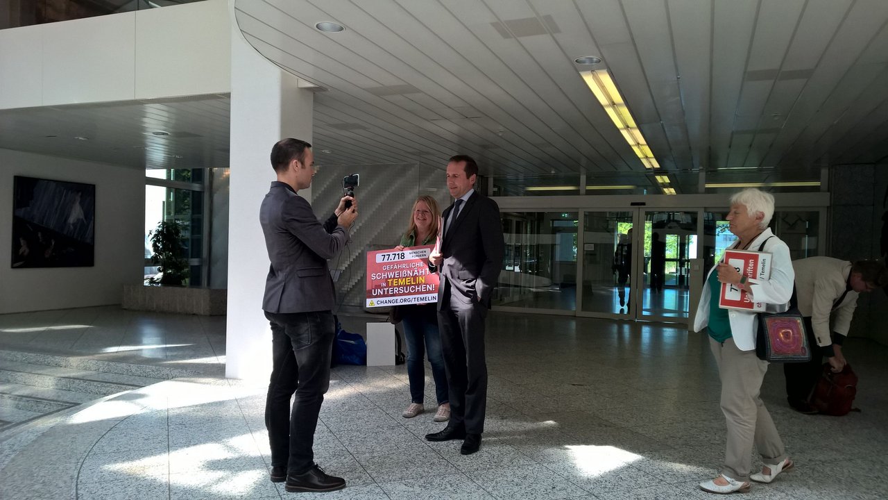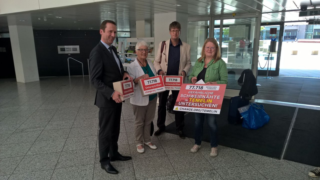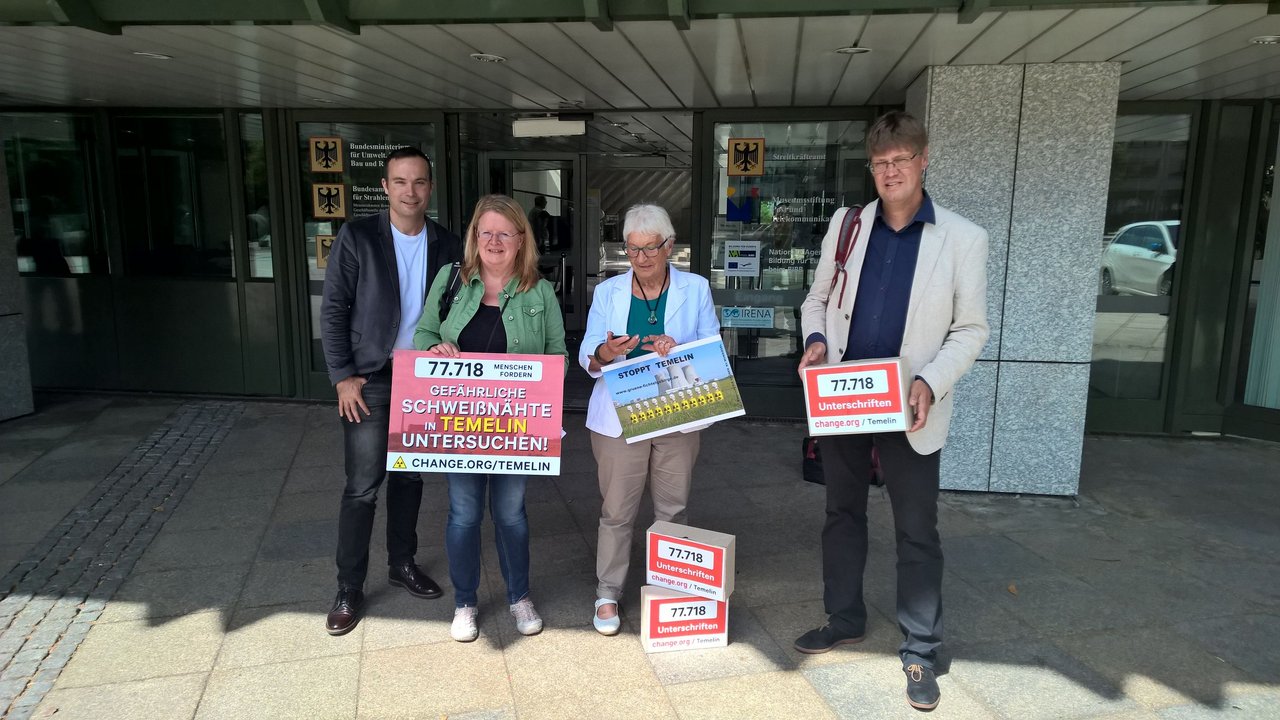Über 77.000 Unterschriften hatte die Initiatorin der Temelin-Petition Brigitte Artmann deswegen am vergangenen Donnerstag in Bonn im Bundesumweltministerium an Ministerialdirigent Thomas Elsner, den technischen Leiter der Atomaufsicht überreicht, immer begleitet vom Facebook-Livestream von Change.org. Die Unterzeichner fordern die sofortige und umfassende Prüfung der Aktenlage. Unterstützt werden sie dabei von den Landräten Franz Meyer aus Passau und Dr. Karl Döhler aus Wunsiedel, beide CSU. Auch die Landräte aus Regen, Michael Adam, SPD, und aus Freyung-Grafenau, Sebastian Huber, CSU, ziehen inzwischen laut örtlichen Medien nach (Onlinemagazin "da Hog'n"). In Bonn dabei waren neben Gregor Hackmack von Change.org, der kritisch bei Thomas Elsner nachhakte, auch Jan Haverkamp, der für Greenpeace zusammen mit seinem damaligen Chef in Prag die Sache aufdeckte, die Passauer Kreisrätin Halo Saibold sowie die Petentin Brigitte Artmann selbst, sie ist Kreisrätin im oberfränkischen Wunsiedel und Sprecherin der Initiative STOPPT TEMELIN.