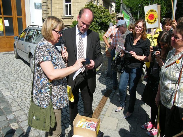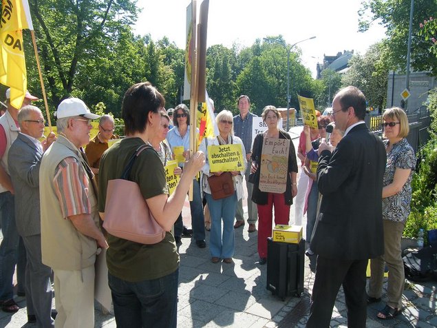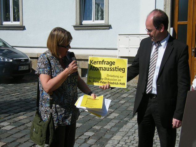 Am 20.Mai 2011, Freitagvormittag um 10:00, fanden sich bei strahlendem Sonnenschein v or dem CSU-Wahlkreisbüro in der Schützenstr. 1 in Hof im Rahmen der Campact-Bürgerlobby-Aktion für schnellstmöglichen Atomausstieg fast fünfzig Bürgerinnen und Bürger aus dem ganzen Einzugsgebiet des Wahlkreises Hof/Wunsiedel ein.