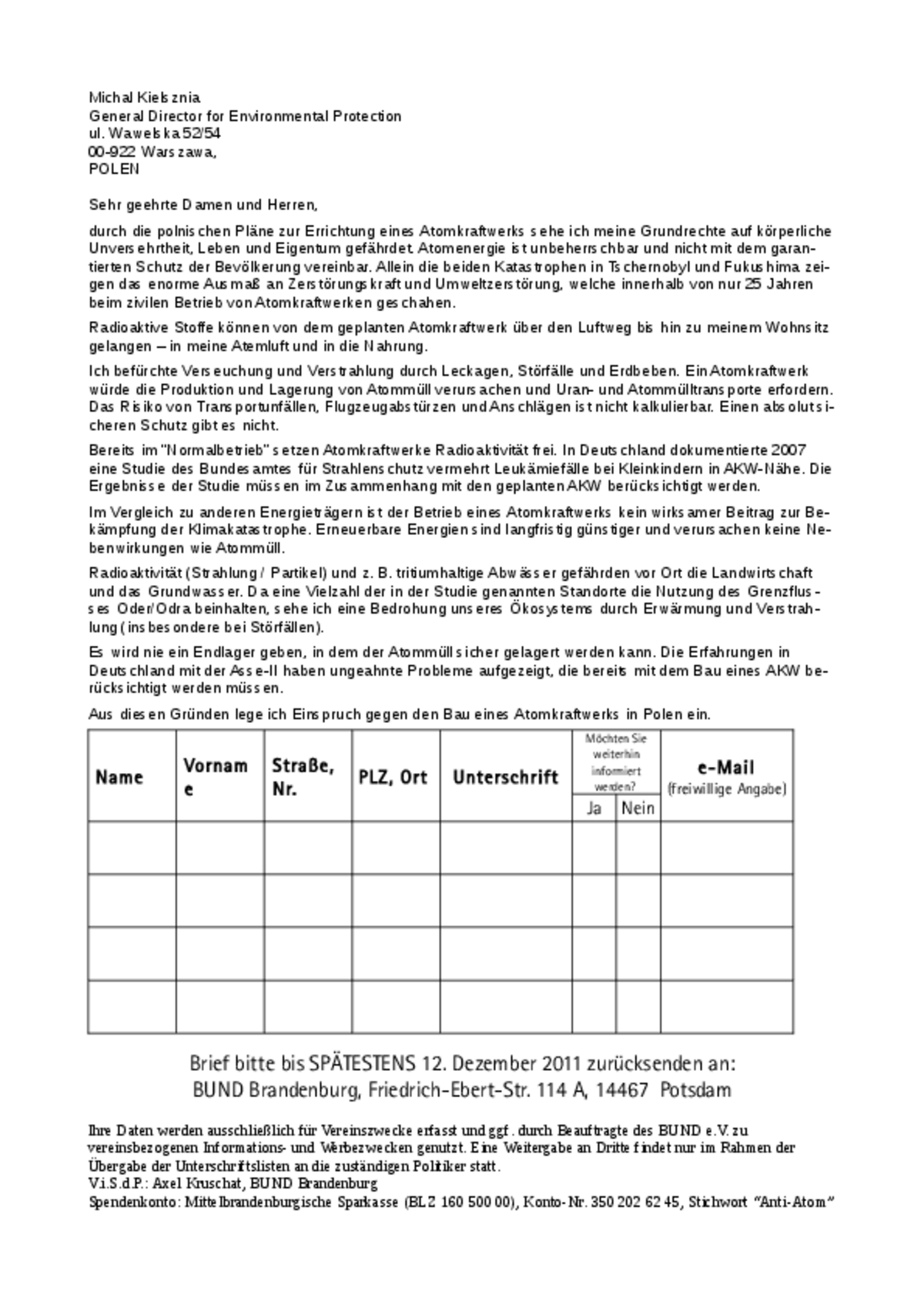 Vor zwei Wochen bekamen wir von Journalisten in Potsdam die Frage vorgelegt was Brandenburg und Bürger noch machen können gegen das polnische Atomenergieplan. Ich habe die Frage unseren Anwälten vorgelegt. Ihr habt unterstützend oder direkt teilgenommen an der SUP-Prozedur bez. das polnische Kernenergieprogramm. Vor einem Jahr wurde das Programm durch den polnische Ministerrat angenommen, aber erst Mitte Dezember (also nach 11 Monaten) wurde die Begründungen und Beiträge an der SUP in der Endversion mit aufgenommen und wurden an die deutschen und österreichischen Behörden verschickt. Die Teilnehmer am SUP haben immer noch nichts gehört. Greenpeace Polen hat schon im Sommer eine Klage eingereicht, der jetzt auf dem gerichtlichen Weg ist. Nachdem jetzt auch die deutschen und österreichischen Behörde informiert sind, ist auch den Klageweg für die Teilnehmer offen.
