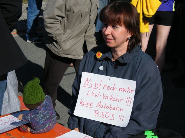 Kerstin Popp aus Hohenberg von der BI gegen die Fichtelgebirgsautobahn Ost: "An der B303 von der A93 bis zur Grenze geht es aber nicht um Ortsdurchfahrten, die gibt es bereits überall. Sondern geht um den vierspurigen Ausbau. Und dies, obwohl die Straße bereits jetzt für 20.000 Fahrzeuge ausgelegt ist und deshalb problemlos das doppelte oder gar dreifache des jetzigen Verkehrsaufkommens bewältigen kann.“